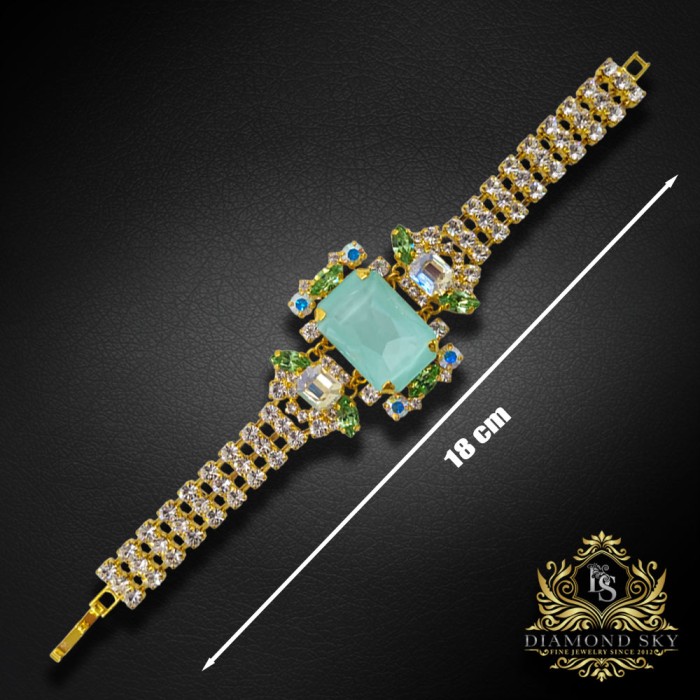 Izsmalcināta aproce no ekskluzīvās Diamond Sky kolekcijas, rotāta ar Swarovski™ kristāliem toņos Soft Mint Ignite, Moonlight, Reinvented Peridot un Crystal AB. 18k zelta pārklājums piešķir maigajam menta centram īpašu siltumu un spīdumu. Katrs “Aurora” elements iemieso gaismu un sievišķīgu grāciju – rotaslieta, kas apbur ar savu eleganci.