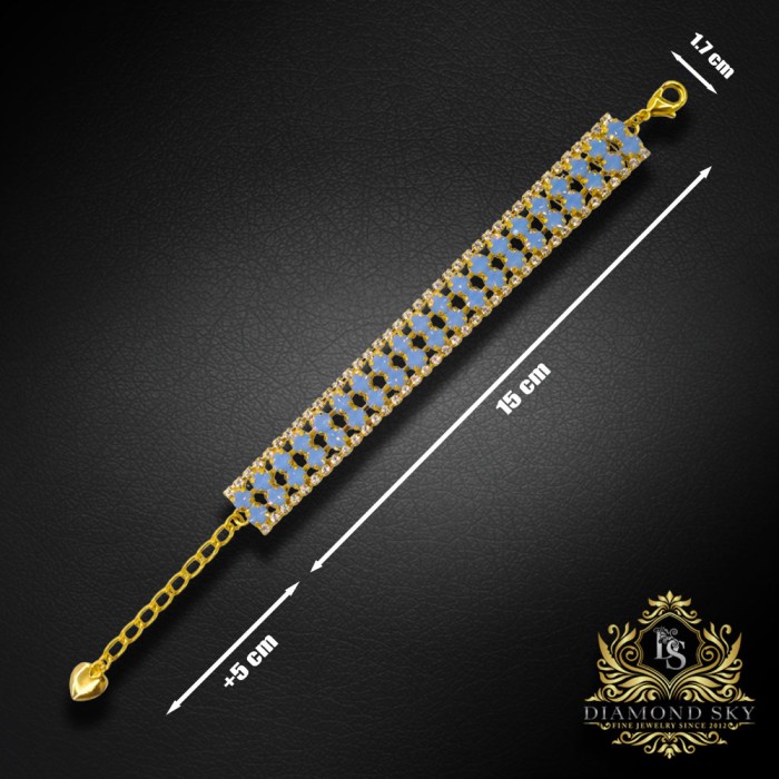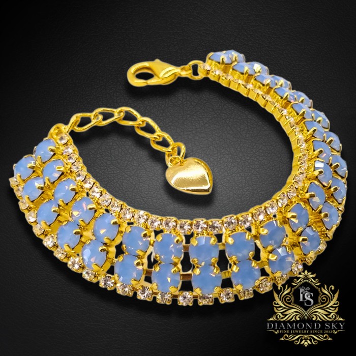 Ekskluzīvā Diamond Sky kolekcijas aproce iemieso izsmalcinātu eleganci un mierpilnu gaismu, kurā maigi Light Sapphire Opal kristāli no Preciosa™ mirdz kā rīta saules stari uz horizonta. 18k zelta pārklājuma siltā nokrāsa izceļ katra akmens starojumu, radot ideālu līdzsvaru starp eleganci un mieru – mūžīgu skaistuma un izsmalcinātības simbolu.
