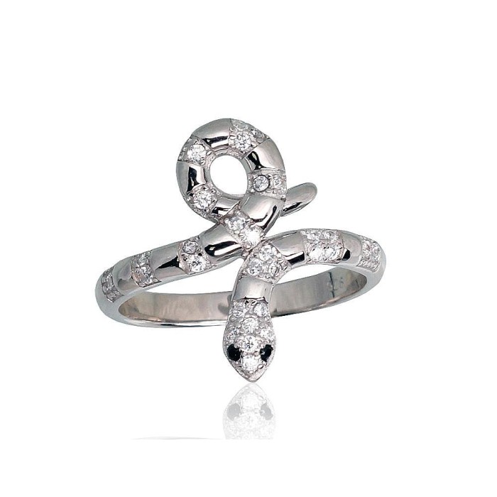 Izteiksmīgs čūskas formas gredzens no 925 proves sudraba ar rodija pārklājumu, rotāts ar mirdzošiem cirkoniem. Simbolizē gudrību, pārvērtības un spēku.
