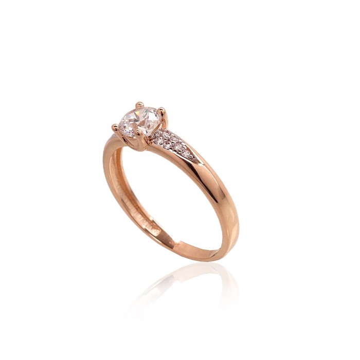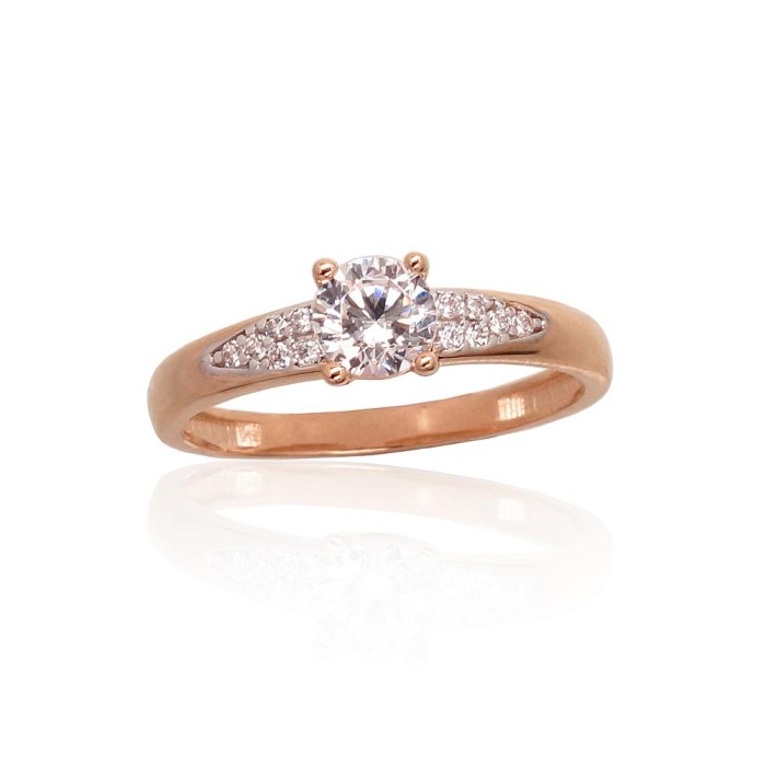 Elegants 585° sarkanā zelta gredzens ar rodija pārklājumu. Centrālais cirkons ir papildināts ar smalku cirkonu joslu, kas izceļ dizaina līdzsvaru un mirdzumu.
